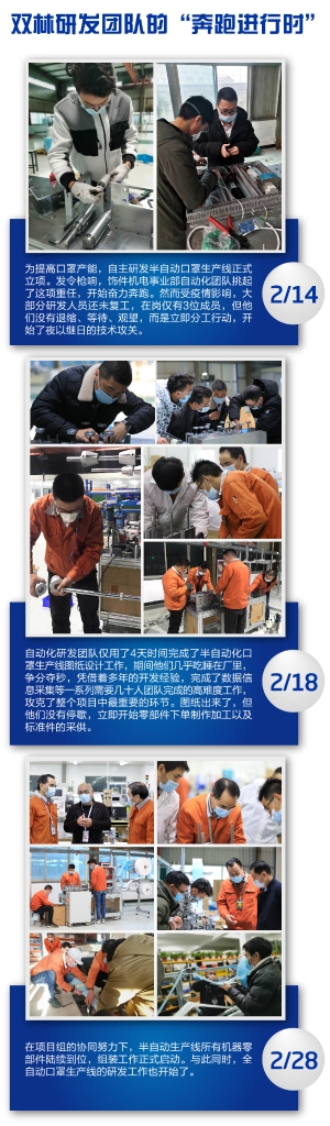 虽然前期无相关资源积累,但是项目组在负责人邬建成的带领下凭借着丰富的经验、专业的技术素养、敢闯敢拼的双林品格,经过不懈奋战与努力,终于攻克下了一个个技术壁垒,完成了半自动口罩生产线的设计、制造、组装、调试、投产,这是一项重要的突破,意味着公司在口罩生产领域实现了往上游延伸,产业链更加完善,具备了口罩设备制造的核心能力。下一步,项目组将把耳线焊接等工艺加入到产线,进一步提升产线自动化程度,逐步淘汰手动生产,以大幅提升口罩生产效率和产品质量。